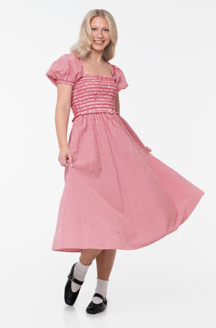 GINGHAM SMOCK SS MIDI DRESS